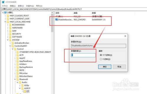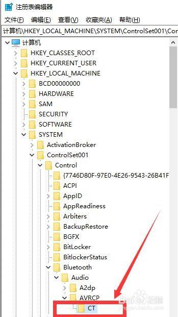 接下来在注册表中依照下面的顺序点击:HKEY_LOCAL_MACHINE\SYSTEM\ControlSet001\Control\Bluetooth\Audio\AVRCP\CT