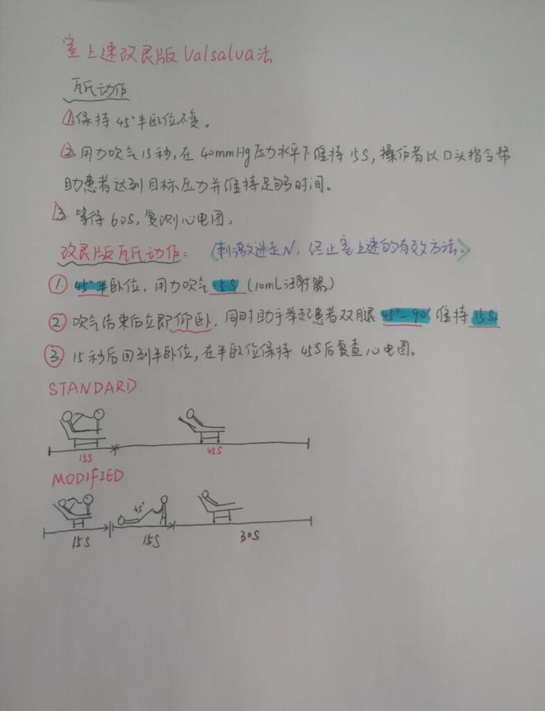 (2)改良 Valsalva 动作:在标准 Valsalva 动作的基础上有所改良,其方法是先进行标准 Valsalva 动作,然后立即平卧和被动抬高下肢,具有更高的复律成功率。